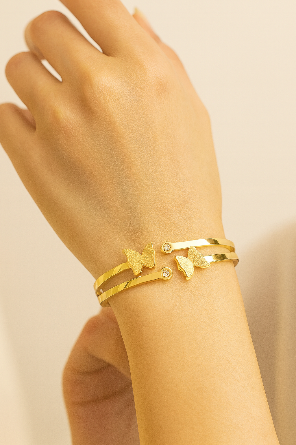 Embrace elegance in motion with our Golden Butterfly Grace Bracelet, a timeless piece that captures the beauty and freedom of fluttering wings. Designed with dual butterfly motifs highlighted by sparkling zircon accents, this bracelet shines with 18k golden tone high-quality polish, radiating charm and sophistication. With its anti-tarnish and waterproof finish, this bracelet ensures durability and long-lasting brilliance, making it an ideal companion for both everyday wear and grand occasions. The double-band design adds a touch of modern artistry, while the secure clasp ensures comfort and ease.