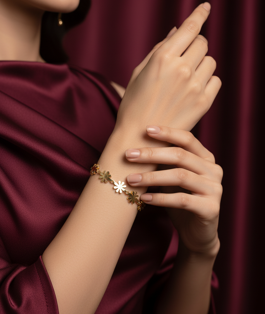 When to Wear: Perfect for festivals, weddings, and family gatherings, styled with sarees, lehengas, or Anarkali's. Ideal for daytime events, brunches, or casual outings, paired with floral dresses, kurtis, or Indo-western looks. A wonderful gifting option that symbolizes freshness, positivity, and youthful charm. The Golden Daisy Charm Bracelet is more than jewellery — it’s a symbol of happiness and elegance, designed to make every occasion bloom. Order now at Tasmaye.com