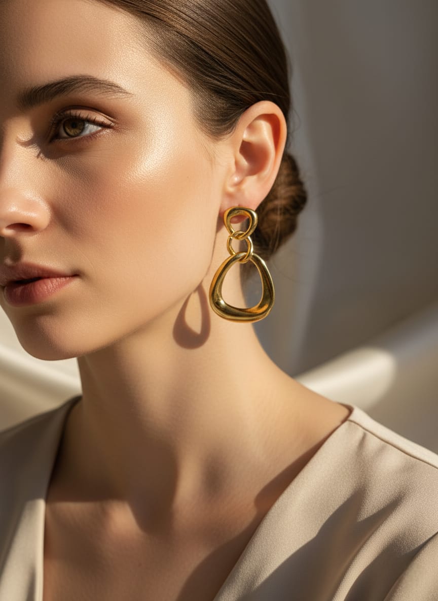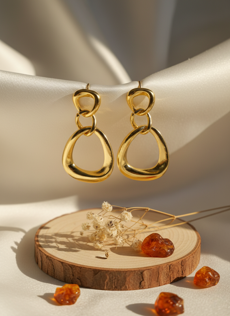 Illuminate your style with the Solara Loops Earrings, a bold yet graceful expression of modern artistry. Designed with interlinked geometric drops, these earrings capture the essence of flowing light and radiant elegance. Their sculptural silhouette, bathed in a lustrous golden finish, makes them a statement piece that transitions effortlessly from day to night.