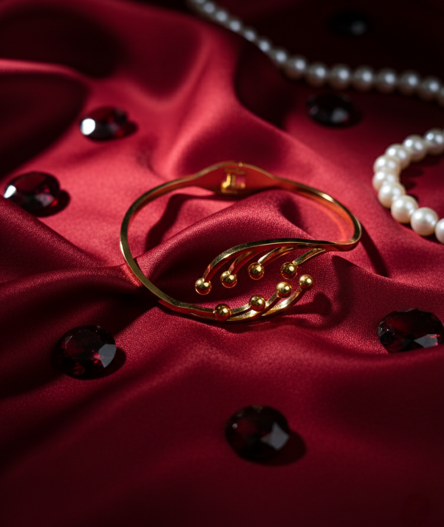 Our Golden Orbit Wave Bracelet. Designed with fluid wave-like curves and accentuated by polished golden spheres, this bracelet embodies harmony, balance, and sophistication. Its unique openwork pattern adds a touch of contemporary charm, making it a versatile piece for both everyday wear and special occasions. Crafted with premium 18k gold plating, this bracelet shines with a radiant golden glow while offering anti-tarnish and waterproof durability. Lightweight and comfortable, it ensures long-lasting beauty and effortless wear.