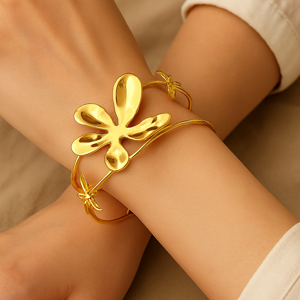 Bring nature’s artistry to your style with our Golden Petal Bloom Bracelet, a statement piece that celebrates the beauty of blossoms. Featuring oversized sculptural petals in a radiant 18k golden tone high-quality polish, this bracelet is both bold and elegant, making it a true showstopper. Engineered with anti-tarnish and waterproof technology, it promises long-lasting shine and durability. Its open cuff design ensures a comfortable fit, while its lightweight build allows you to wear it effortlessly all day or night.